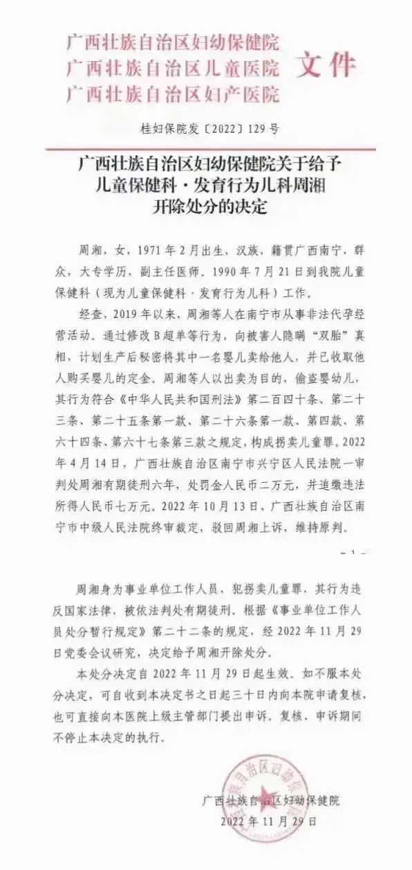 两天前,一份疑似某地医院的红头文件照片被全网关注,这是一份盖有广西妇幼保健院公章,题为《关于给予儿童保健科·发育行为儿科周湘开除处分的决定》(下称“开除决定”)的文件截图。