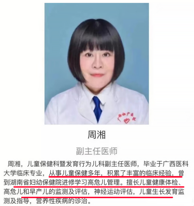 “周湘,女,副主任医师,毕业于广西医科大学临床专业,从事儿童保健多年,积累了丰富的临床经验,曾到湖南省妇幼保健院进修学习高危儿管理。擅长儿童健康体检、高危儿和早产儿的监测及评估,神经运动评估,儿童生长发育监测及指导,营养性疾病的诊治。”