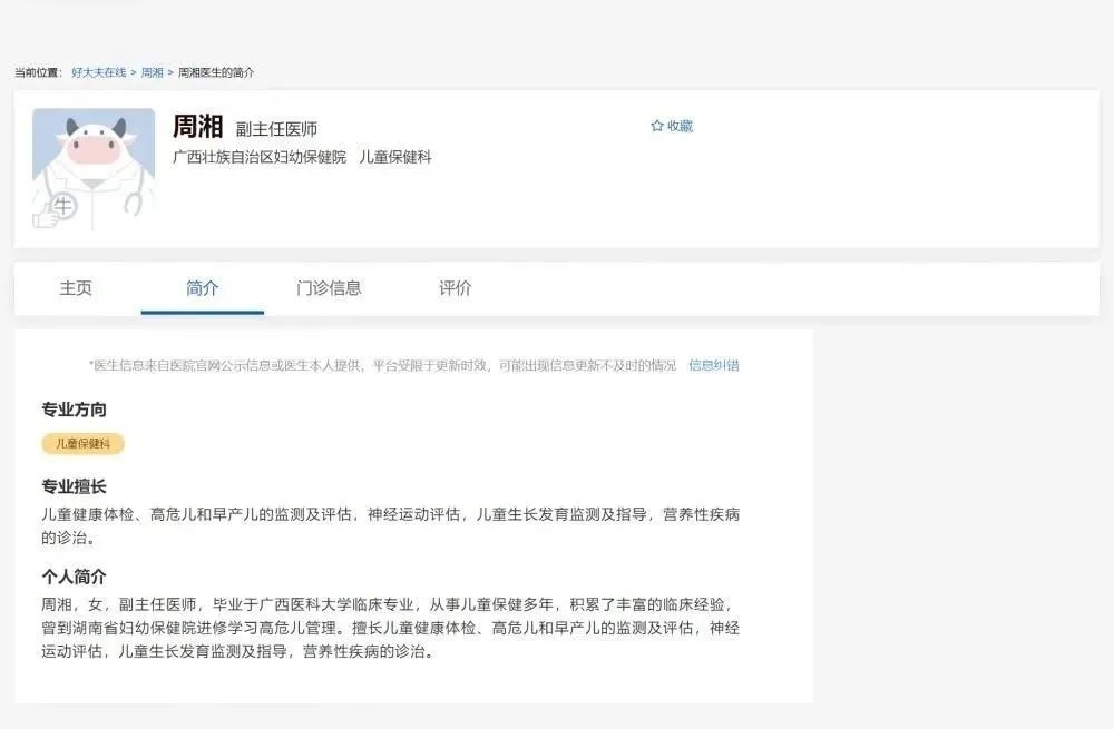 红头文件发布后,广西妇幼保健院官网儿童保健科医生名单中已经没有“周湘”的名字了。
