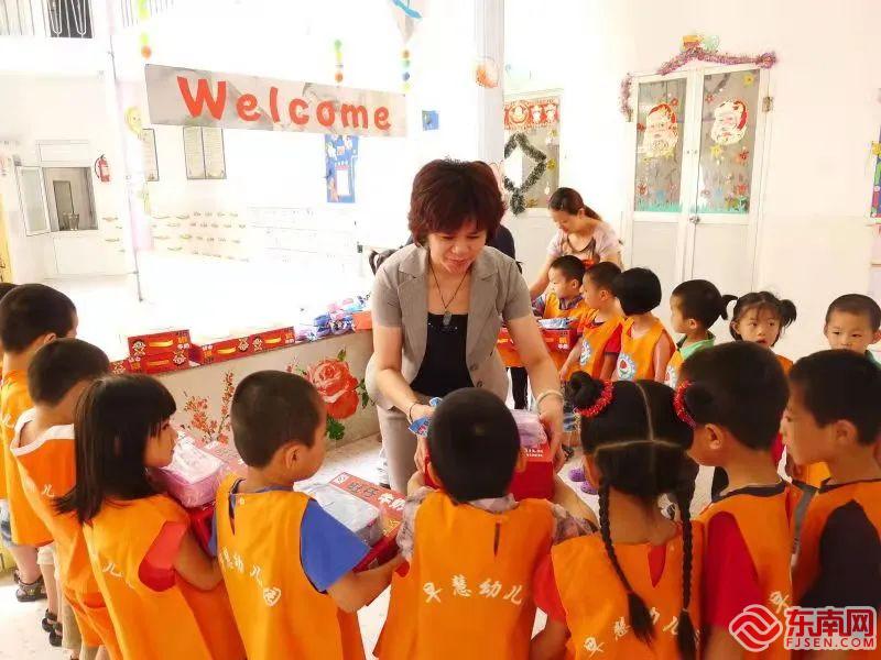 李淑莲为幼儿园贫困家庭儿童送上“六一”节的书包、文具等慰问品。(湖里区妇幼保健院供图)