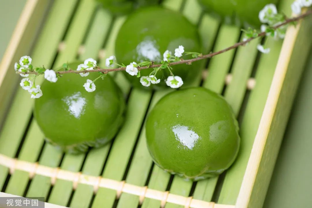 惊蛰到清明这段时间,江南一带的人们有吃“青团”的习俗。当地人把艾草的汁拌进糯米粉里,再包裹进豆沙馅或者莲蓉做成青团。青团不甜不腻,有清淡却悠长的艾草香气。