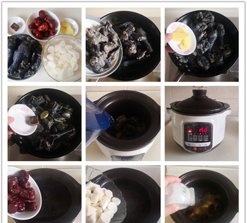 小贴士:1.先用少许油煸炒干乌鸡块的水分,加入姜片和红糖翻炒均匀;2.将炒过的乌鸡块放入电炖锅中,一次性加入足量的水,按下电炖锅中炖煮鸡汤的功能键;3.还剩下30分钟时加入红枣进锅炖煮,还剩下10分钟时加入铁棍山药进锅炖煮,煮好后加入盐等调味即可。