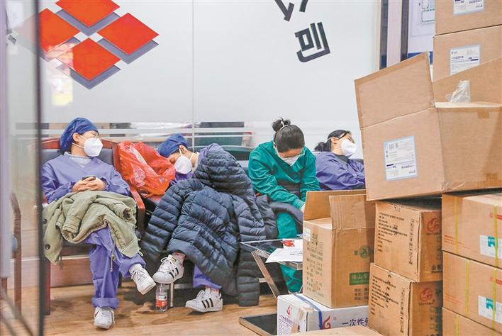 太累了! 近日,深圳市龙岗区坂田街道大批工作人员直奔一线,搭建采样点帐篷。忙碌了一夜的医务人员坐在凳子上睡着了。 深圳特区报记者 杨少昆 任琦 摄