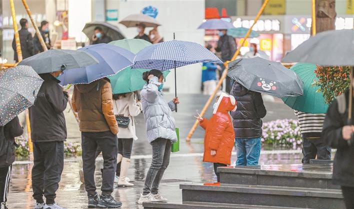 猜着拳,等采样! 连日来,我市天气寒冷阴雨,华强北街道核酸检测点,家长带着小孩猜拳,有序排队等待采样。 深圳特区报记者 何龙 摄
