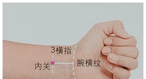 伸开手臂,掌心向上,握拳并抬起手腕,可以看到手臂中间有两条筋,内关穴就在离手腕距离