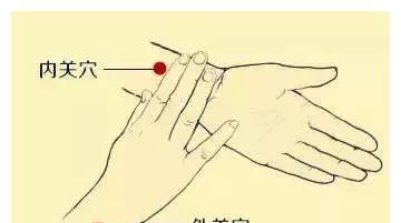 用左手拇指指腹按揉右侧内关,按摩5分钟;再用右手拇指指腹按压左侧的内关,按摩5分钟,每日2~3次。