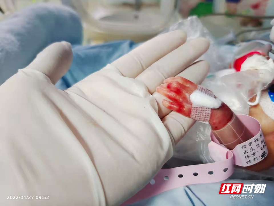 1月24日,36岁的李女士(化名)在衡阳市妇幼保健院早产生下470g超早产男婴。然而,由于胎龄仅仅24周,男婴身体只有成人巴掌大小,身体很多器官都未发育完全,全身几乎透明淤青,没有自主呼吸、心跳很微弱,予窒息复苏后转入NICU病房。患儿被诊断为:超早产儿、超低体重儿、脓毒败血症、凝血功能障碍、新生儿窒息等,生命垂危,予以气管插管有创呼吸机等措施进行救治。