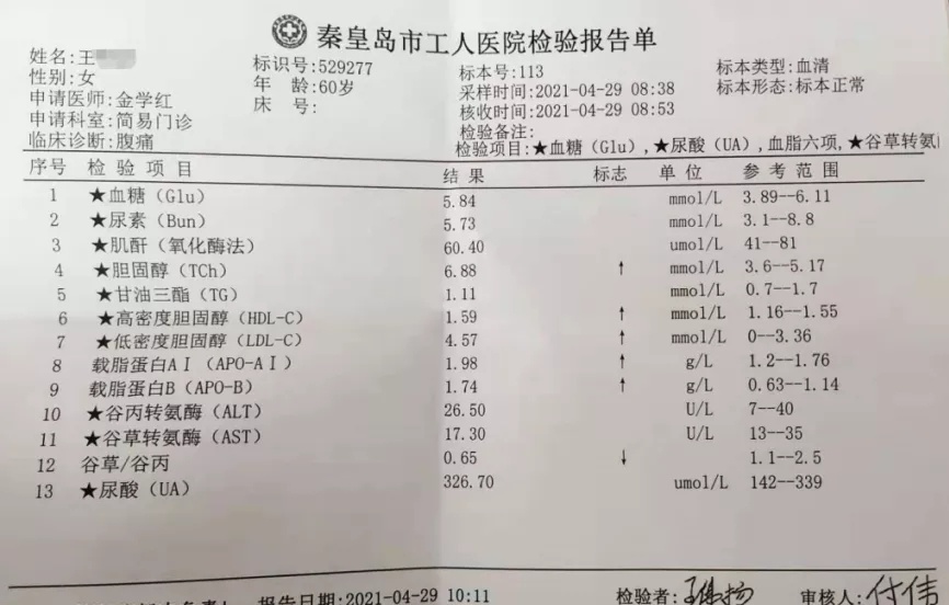 第二日至医院检查血脂显示:低密度胆固醇LDL升高,胆固醇TC水平整体升高。建议王女士在饮食上要注意减少食盐、糖类、烧烤类、油炸类、熏制类食物的摄入,平衡膳食,控制血脂。