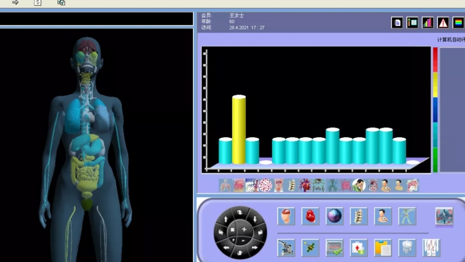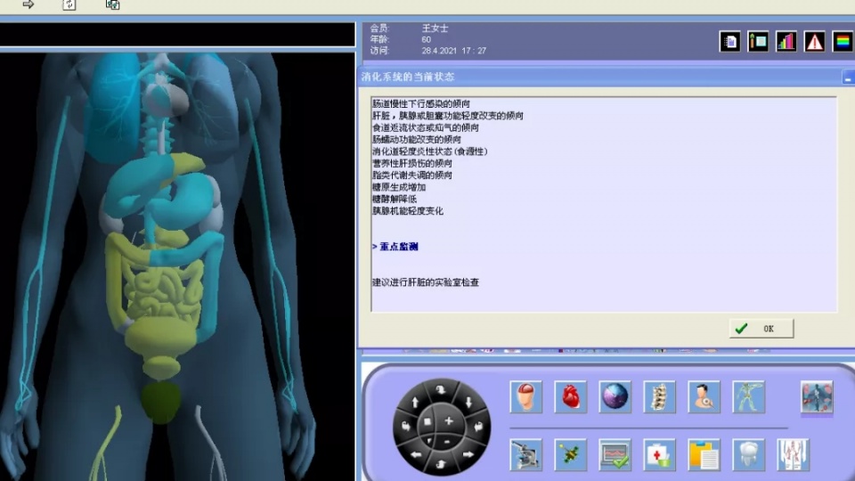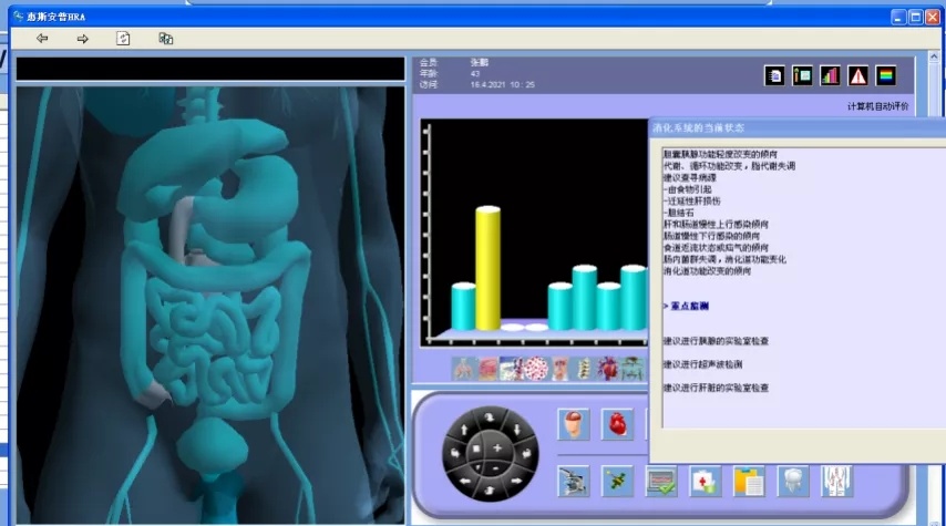 于是,王女士在家人的陪同下到医院做了HRA健康风险评估,5分多钟后等到了检测结果,系统提示:肝脏生物活性下降,脂类代谢失调。从检测图像可以直观看出肝脏器官标记为蓝色、黄色,有功能改变倾向。结合检测结果,医生建议进一步进行肝脏的实验室检查。